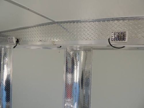 Are you looking for a really nice trailer to keep or transport your prized motorcycles? How about an awesome insulated garage? We built this trailer in 2012 and spent extra to do it nice. We did the rivetless sides (after our old trailer lost a whole side panel on a trip) did the internal fenderwells to give maximum interior space, added the V nose front to save fuel and also give space, then added the diamond plate option inside and out. We chose the rear tailgate door with diamond plate and aluminum 15″ wheels with a spare on radial tires.