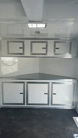 Race Ready 2 Package: Includes – Base and Overhead Cabinets, RTP Flooring, Ramp and Flap, 48×54 Escape door, 48″ side door with RV Style flush lock and Bar Lock, Anodized Corners, Triple tube tongue, All LED Light package, White or Mill Finished walls and ceiling, Electrical PAckage with 30 Amp Box, 25′ Lifeline, 2 – 4 foot fluorescent lights, 2 – receps.,2 – 500 watt recessed quartz lights, and 2 – rear loading lights. Call Today for immediate delivery or pick-up.