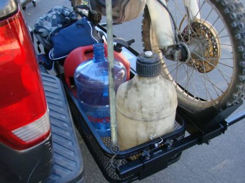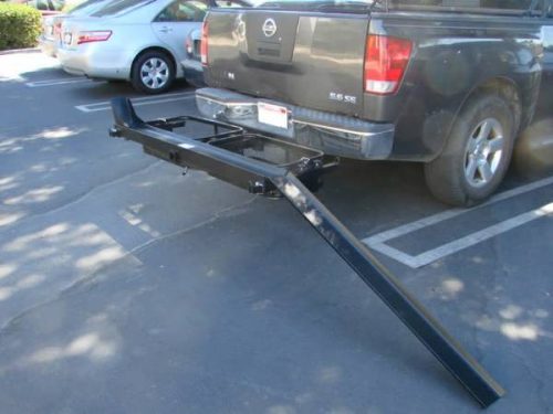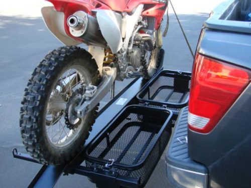 This hitch receiver mounted motorcycle carrier rack hauler trailer rack rail is the solution to transport your motorcycle, scooter or dirt bike. It doubles as a cargo carrier for your gas cans, gear or luggage. The motorcycle carrier has a 1000lb weight capacity. The 58″ long x 5 1/2″ wide loading ramp stores under the carrier to save space.